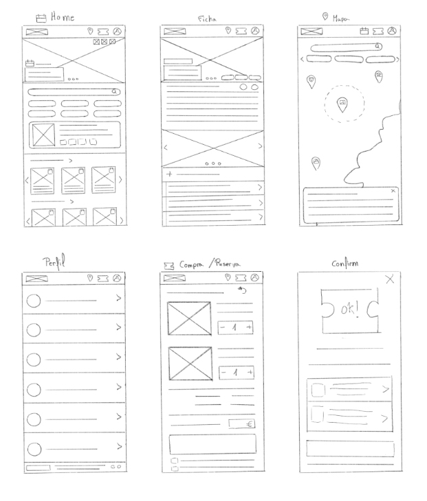 This paper wireframe explored a mobile app to discover cultural and artistic activities outside urban centers. The concept combined a map-based search with complete plans including nearby lodging, food, and public transport, plus tools to filter by preferences and share with friends. The goal was to design a holistic, user-centered experience that connects culture, landscape, and logistics in one place.